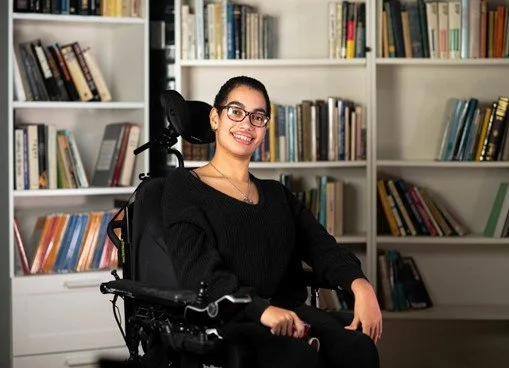 [Image Description]: Jay is a light-skinned Black person with short, dark, curly hair and a bright smile. They are wearing a fitted, textured long-sleeved black shirt and tights. They have a septum piercing and small hoop earrings. The background is slightly blurred but appears to be an interior space with books on shelves andwarm lighting. Jay is seated in their black power wheelchar, looking directly at the camera with an approachable and confident expression.