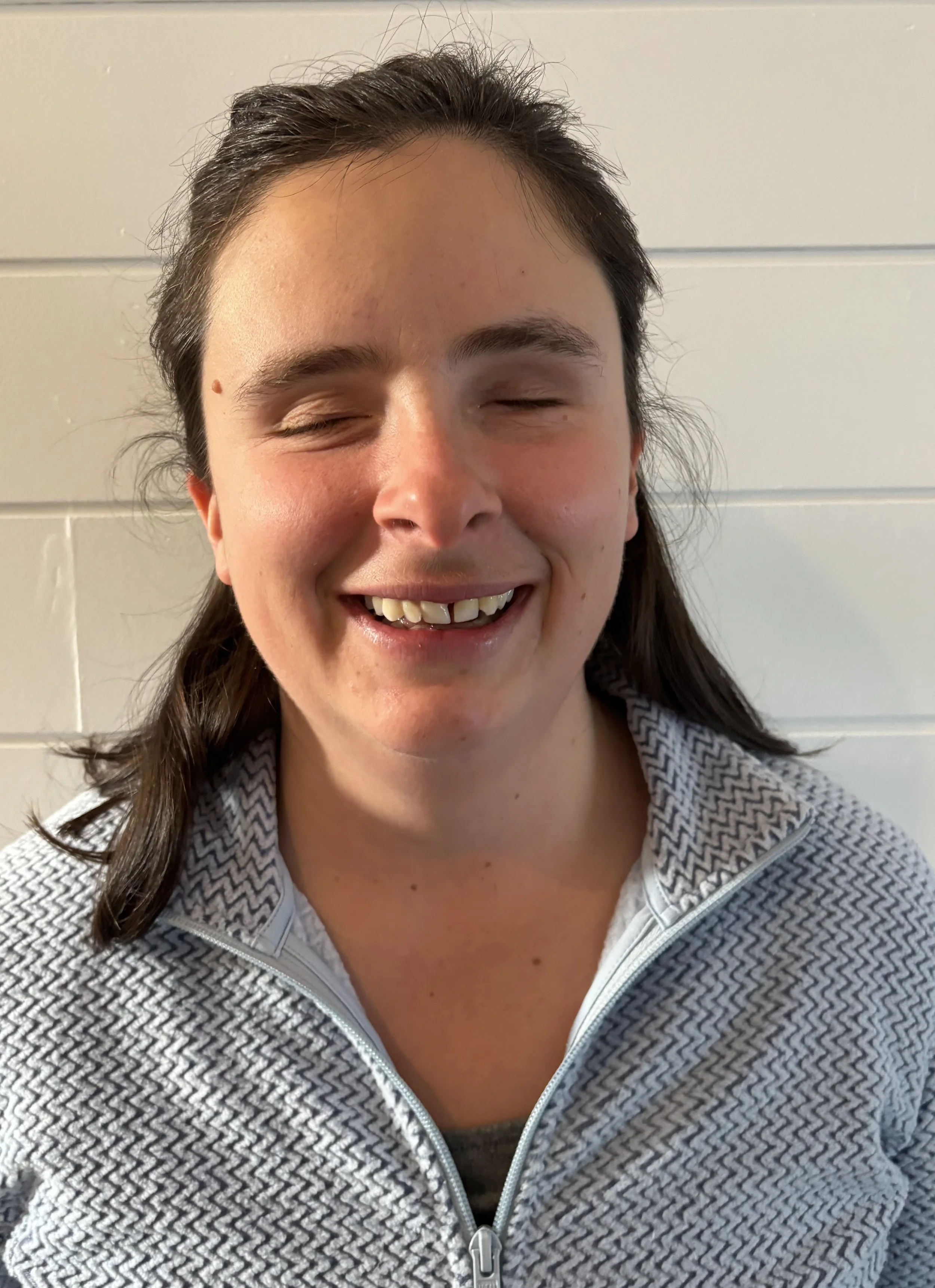 [Image Description]: A smiling woman shown from the shoulders up, with shoulder-length dark brown hair. She is wearing a light lavender zip-up jacket with a chevron pattern and stands in front of a white wall made of horizontal wooden planks. Bright natural light falls across her face from the left side of the image.