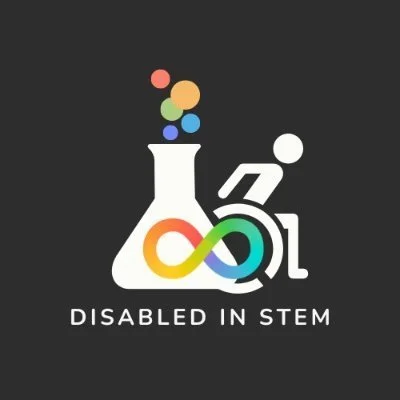 [Image Description]: The logo for Disabled In STEM depicts a wheelchair user next to a bubbling erlenmeyer flask and a rainbow infinity symbol.