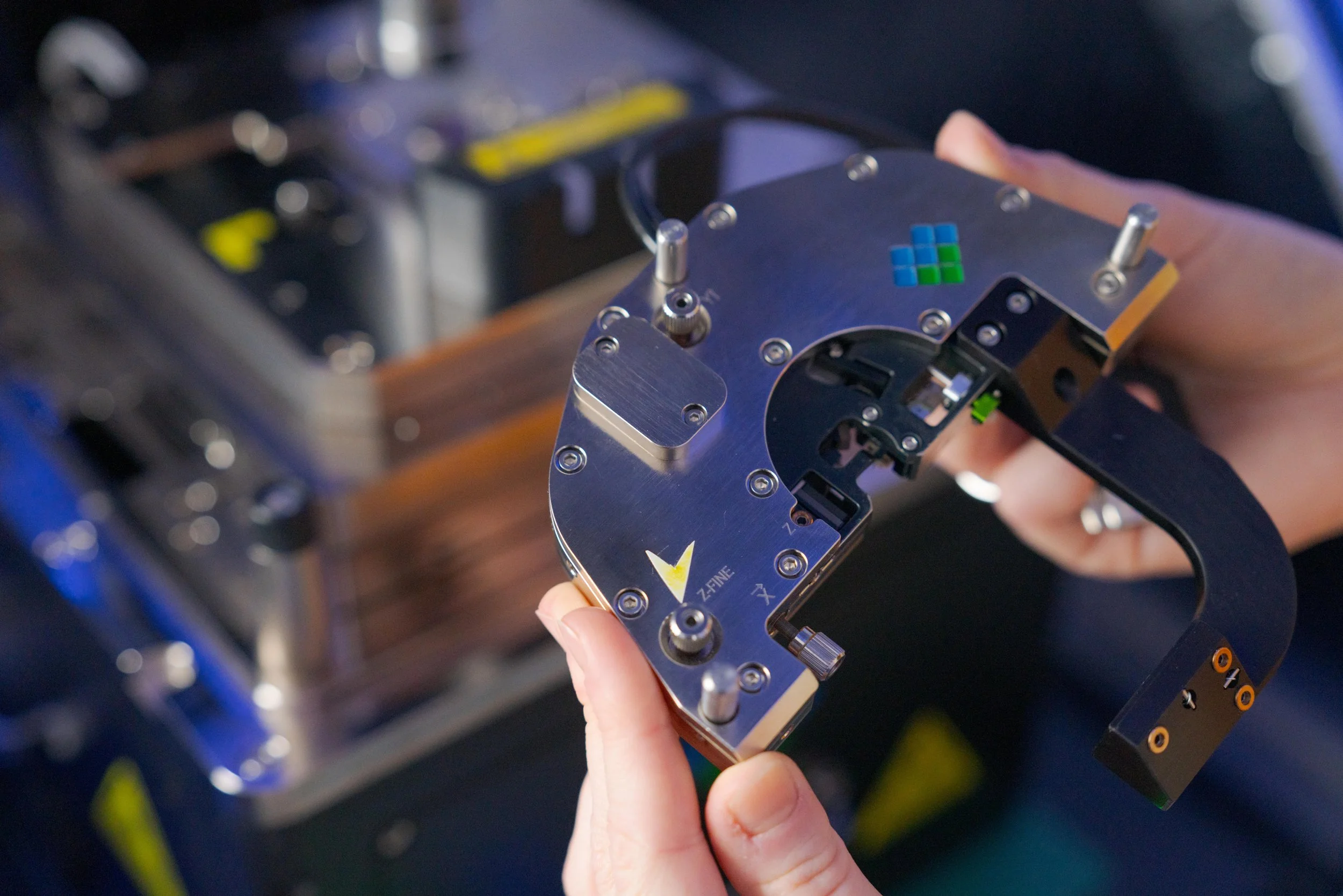 [Image Description]: Dr. Otter hold a critical piece of a microscope with neon visual markers on it in bright blue and green colours. The background is a blurred piece of equipment from the Photo-induced Force Microscopy lab. Photo: Nic Vevers/ANU
