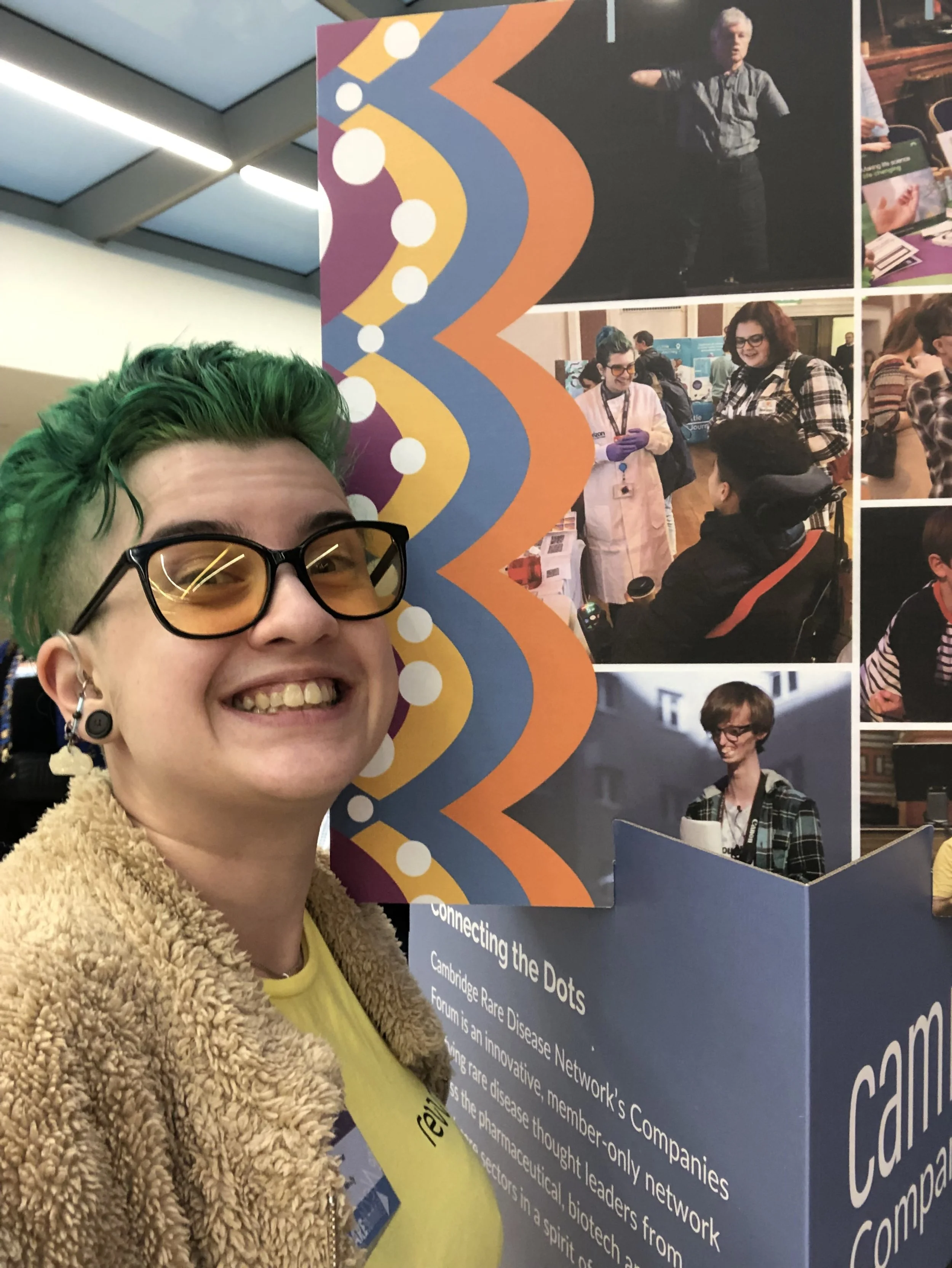 [Image Description]: Max smiles enthusiastically beside an exhibit titled “Connecting the Dots” from the Cambridge Rare Disease Network’s Company Forum. They have bright green hair, glasses with orange lenses, and multiple earrings.